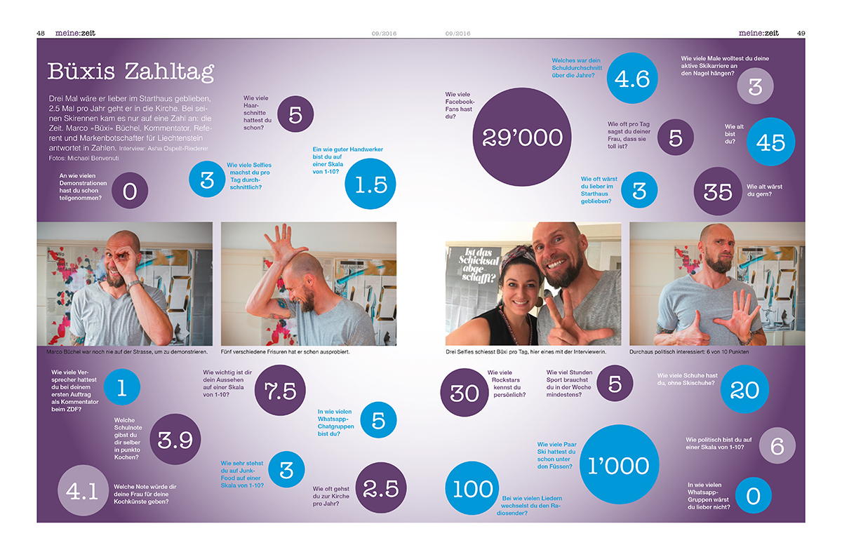 Zwei Jahre lang habe ich im Auftrag des Medienbüros Oehri Kaiser das Interview in Zahlen «Zahltag» für die Zeitung «lie:zeit» geführt. Meine Aufgabe war es, prominente Personen aus Liechtenstein und Umgebung zu kontaktieren, sie zu interviewen – aber so, dass sie nur eine Zahl als Antwort geben konnten – und sie zu einem Selfie mit mir zu überreden. Das war mehr als einmal Grund zum Schmunzeln.